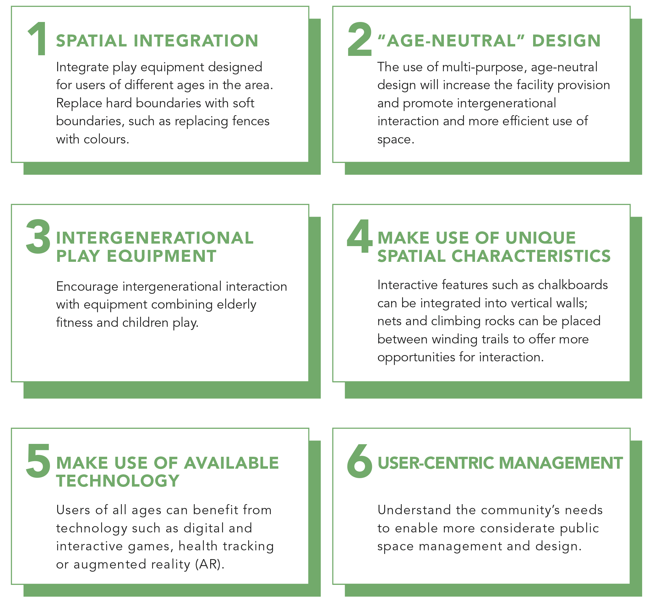 The teams from Season 4 co-creation workshops have consolidated six Intergenerational Play Space design considerations.