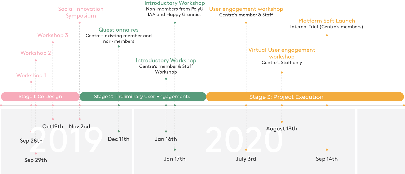 During the design process, we discovered the needs of different stakeholders, including Centre’s Management, Centre’s Staff, Centre’s elderly members and non-member elderly, through several engagement workshops, in order to design an elderly-friendly platform that is suitable for the centre: